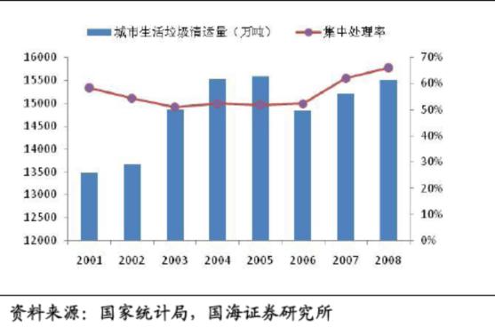 固體廢物可以分為工業(yè)固廢、生活垃圾及危險廢物,而后者的數(shù)量比重很小。2001年至2009年間,工業(yè)固廢的產(chǎn)生量從約9億噸激增到約21億噸,年均復(fù)合增長率達到12%。由于生活垃圾的產(chǎn)生量比較難統(tǒng)計,在統(tǒng)計局給出的數(shù)據(jù)中一般用垃圾清運量指標(biāo)來代替。生活垃圾的實際產(chǎn)生量約為清運量的兩倍,且清運比逐年上升趨勢。2001-2008年,城市垃圾產(chǎn)量復(fù)合增長率為5%,而垃圾清運量的增速僅為2.03%,整體來看,垃圾清運的速度不及垃圾產(chǎn)生的速度,垃圾圍城現(xiàn)象出現(xiàn),垃圾處理問題開始引起民眾和政府的高度重視。截止2007年,我國未經(jīng)處理的城市生活垃圾累計堆存量已達70多億噸,侵占土地面積超過5億多平方米,全國660個城市中有約200個城市陷入垃圾包圍之中。深圳市創(chuàng)新投資集團有限公司發(fā)展
