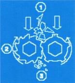 兩個(gè)反向旋轉(zhuǎn)的軸致使顆粒物在雙軸間被粉碎