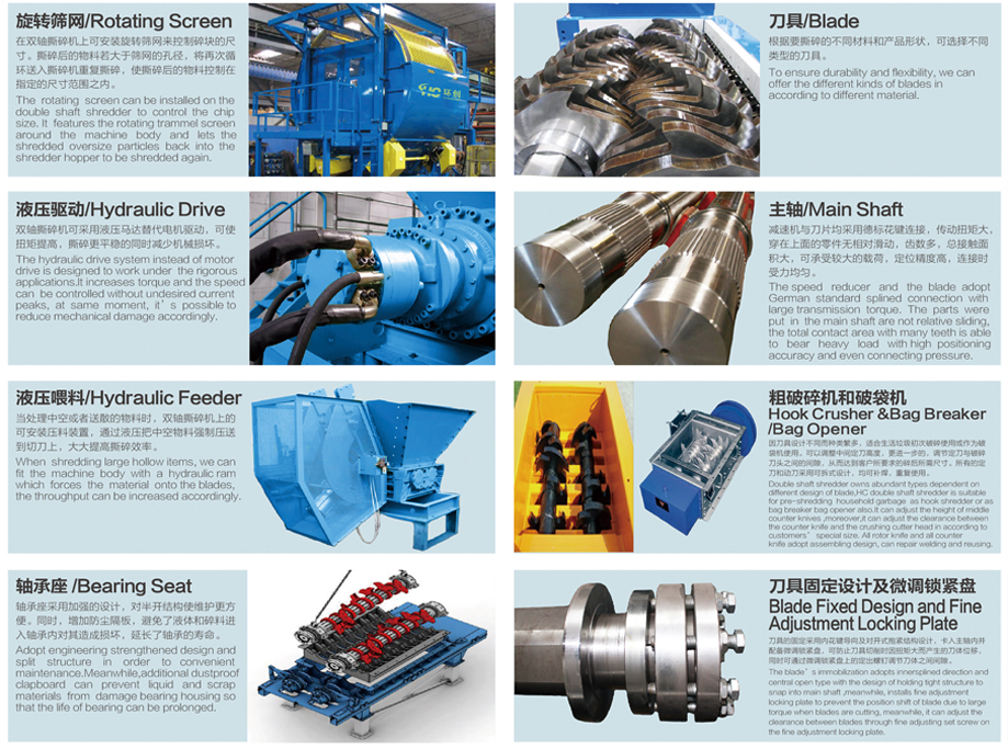 重型雙軸撕碎機適合撕碎特大、特厚難碎物料如:電視機、洗衣機、冰箱外殼、中型管材、管件、叉車托板、輪胎、包裝桶等,汽車外殼、鋁、銅及厚度小于10mm的鐵。