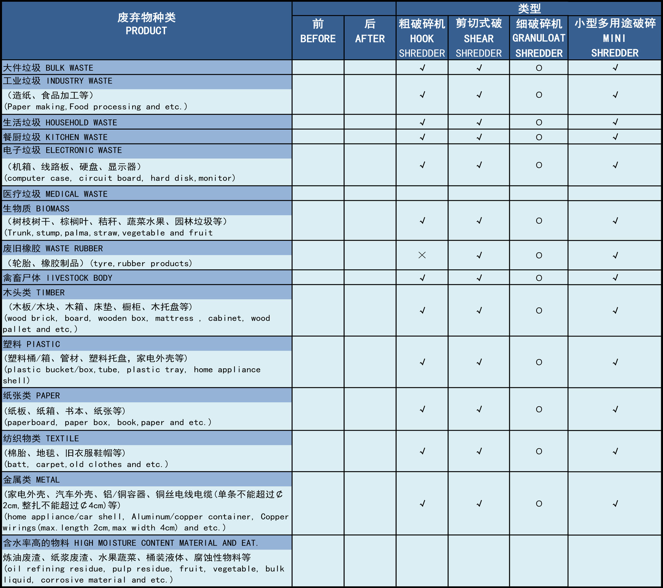 環(huán)創(chuàng)破袋機(jī)(粗破碎機(jī)),低轉(zhuǎn)速,大扭矩,用于破碎生活垃圾、大件垃圾、工業(yè)垃圾、廢舊木材等,將大件的垃圾破碎成200*250mm的碎塊,廣泛用于垃圾衍生物料生產(chǎn)和垃圾焚燒發(fā)電等領(lǐng)域的初步破碎,處理量大,維護(hù)成本低,可靠性好。整套設(shè)備包括電機(jī)、減速機(jī)、兩組刀片軸、料斗、支架、PLC控制柜等組成。它通過兩組動刀軸相向旋轉(zhuǎn),與定刀合力剪切、撕扯、擠壓來減小物料的尺寸。該機(jī)型處理量極大,每小時處理量從10噸到100噸可選。物料的碎后粒徑200*250mm。